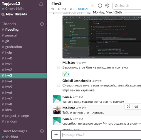 - Поддержка преподавателя, ответы на вопросы и обсуждение занятий и домашних заданий происходит в различных каналах группы проекта (используем мессенджер Slack). Каждый урок/домашнее задание обсуждается в своем канале. Для решения проблем используется удаленный доступ TeamViewer.