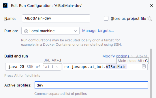 AIBotбином Spring (можем сюда инжектить, например, репозитории для хранения пользователей и результатов), инжектим в него значение@Value("${BOT_HTTP_API_TOKEN}")и через@PostConstructинициализируемClientHandler AIBotMainаннотируем@SpringBootApplicationи через lombok@RequiredArgsConstructorинжектим сюдаAIBot- Запустить проект можно с переменной окружения