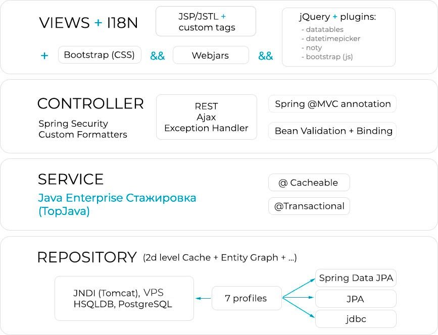 - Большое внимание уделяется деталям: популяция базы, использование транзакционности, тесты сервисов и REST-контроллеров (в проекте более 100 JUnit тестов!), насторойка EntityManagerFactory, выбор реализации пула коннектов, кэширование на уровне Hibernate и приложения. Особое внимание уделяется работе с базой: через Spring JDBC Template, Spring ORM и Spring Data Jpa.